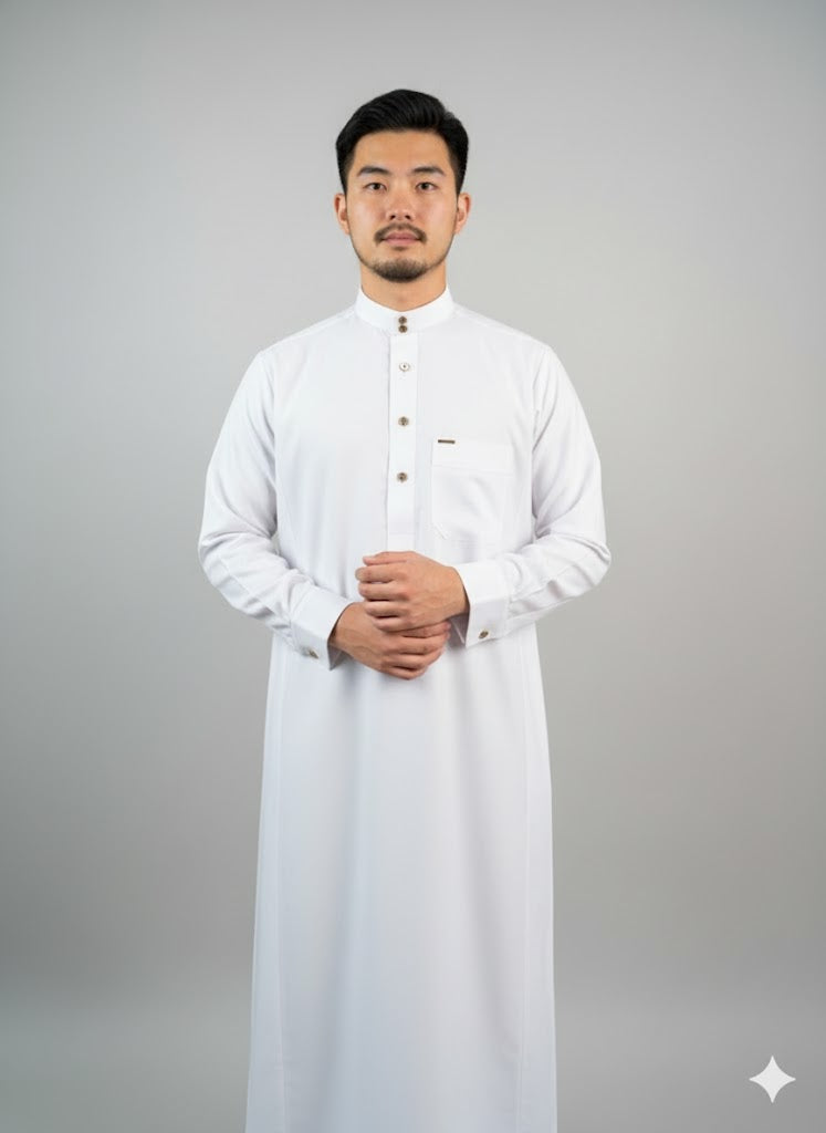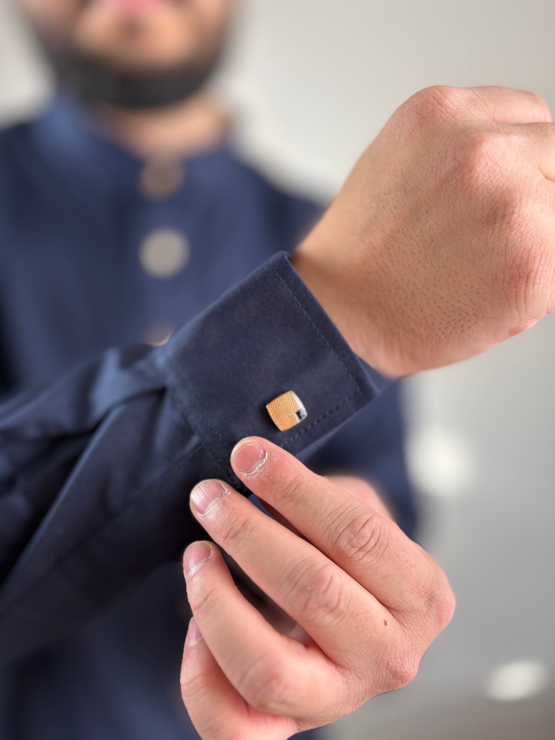 This sophisticated thobe features a clean, traditional silhouette designed for an elegant and dignified appearance. It is characterized by a minimalist shirt collar and a front placket secured by unique, square-shaped metallic gold buttons, which add a distinctive touch of luxury and refinement. The design includes a subtle chest pocket accented with a small metallic detail, completing the tailored and modern aesthetic.