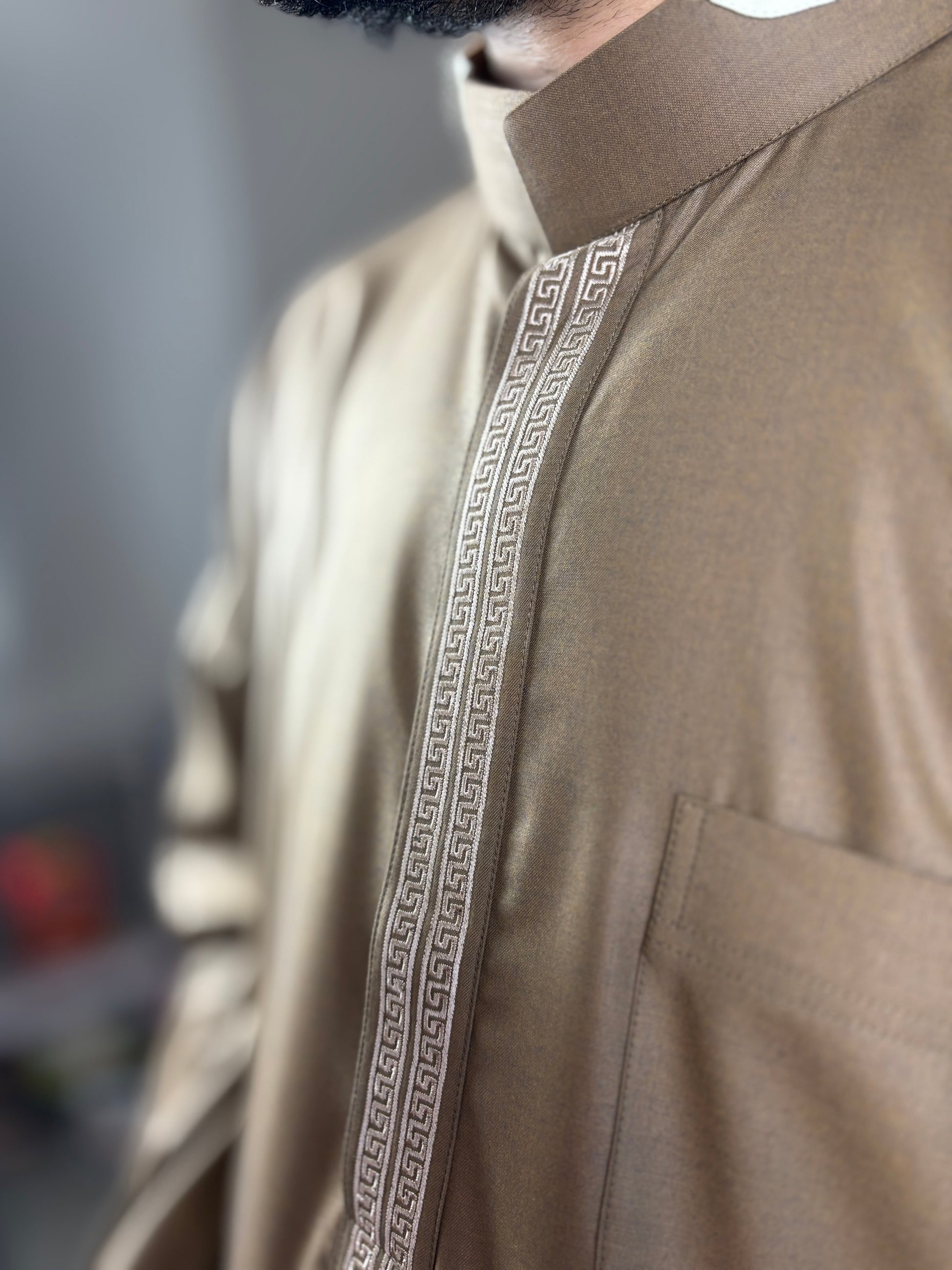 This Saudi embroidered thobe combines classic tradition with a refined, modern finish. Crafted from smooth, premium fabric, it drapes elegantly while offering all-day comfort. The standout feature is the intricate embroidery running along the front placket, adding a touch of sophistication without being overpowering. Its structured collar, clean silhouette, and seamless tailoring make it perfect for both special occasions and everyday wear—an effortless expression of timeless Saudi style.