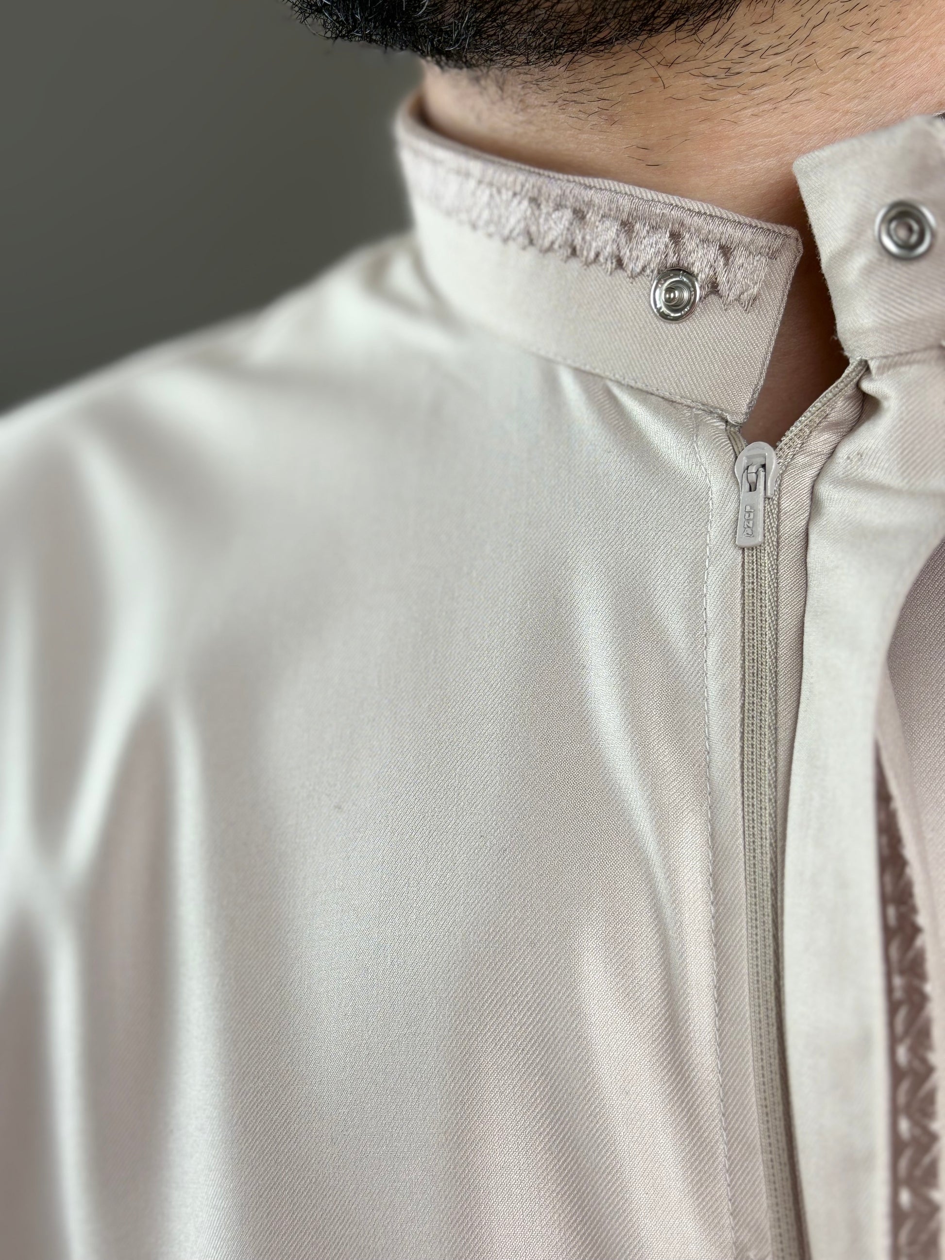This elegant thobe is crafted in a soft, lustrous Cream or Light Beige fabric, perfect for a refined look. The design is highlighted by exquisite contrasting embroidery that runs along the banded (Mandarin) collar and vertically down the front placket. The delicate pattern, likely in a muted gray or taupe shade, adds a subtle texture and traditional artistry. This piece maintains a dignified, clean-cut silhouette, making it an excellent choice for celebratory or formal occasions.